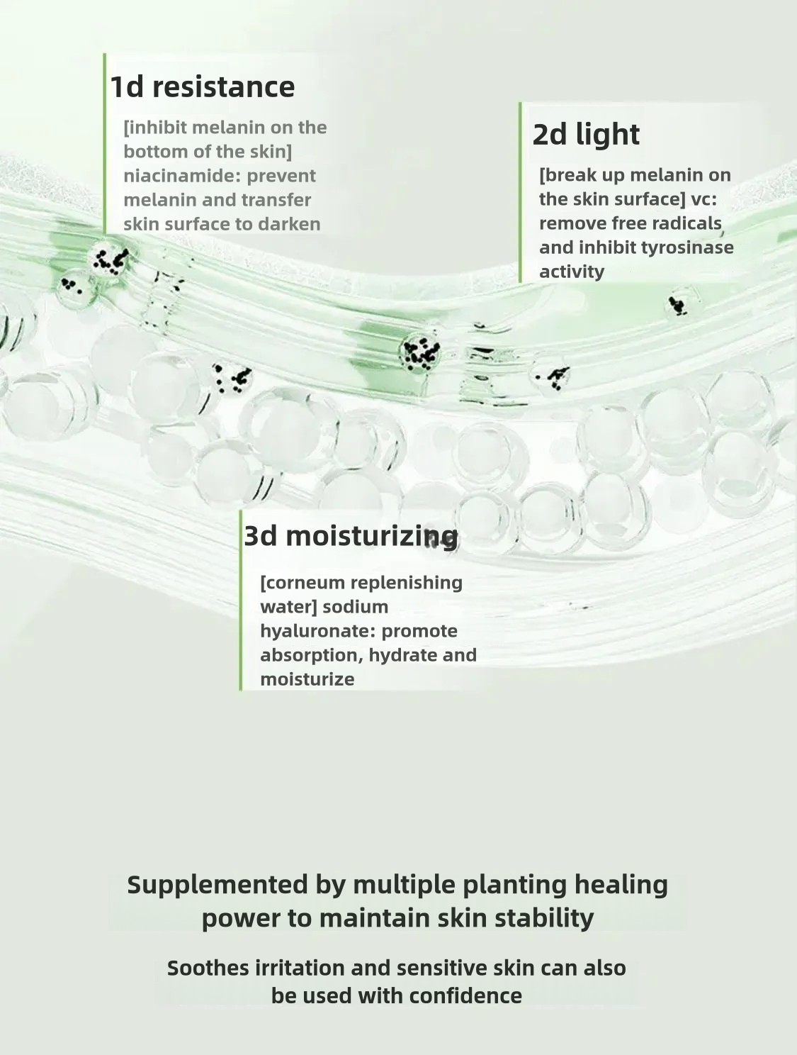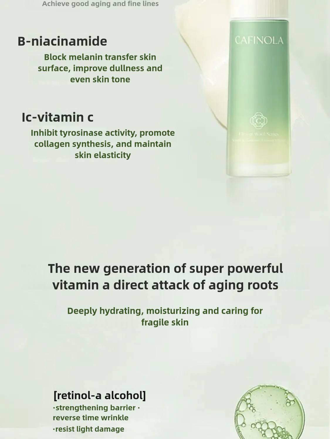 Efficacy: Triple vitamins synergistically enhance anti-oxidation, supplemented by ferulic acid to enhance the transdermal penetration of vitamins, improve the chemical stability of the formula and prevent UV-induced skin photodamage.