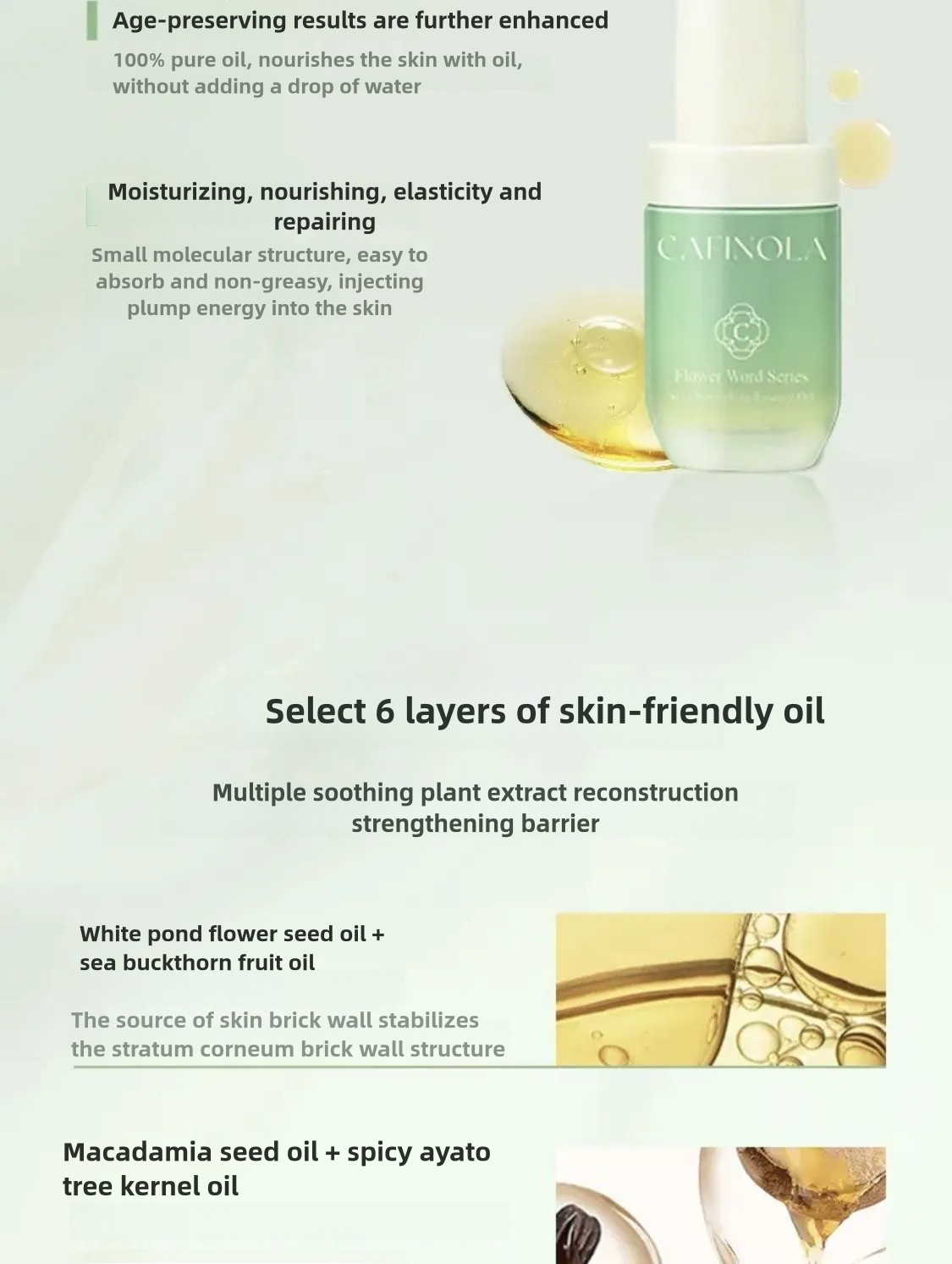 Efficacy: "Anhydrous anti-aging idea, using oil to replenish oil and purer plant fats, simulating the natural lipid composition of the skin, repairing the skin barrier, opening the skin's absorption channels, gently caring for the skin, making the skin soft, shiny and elastic.